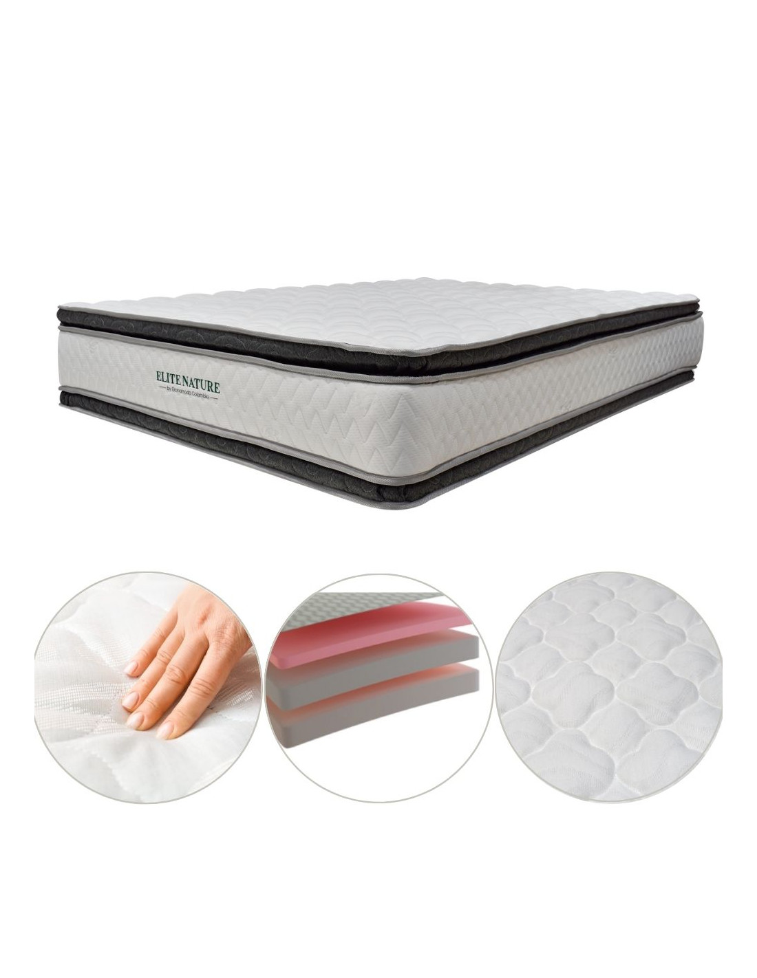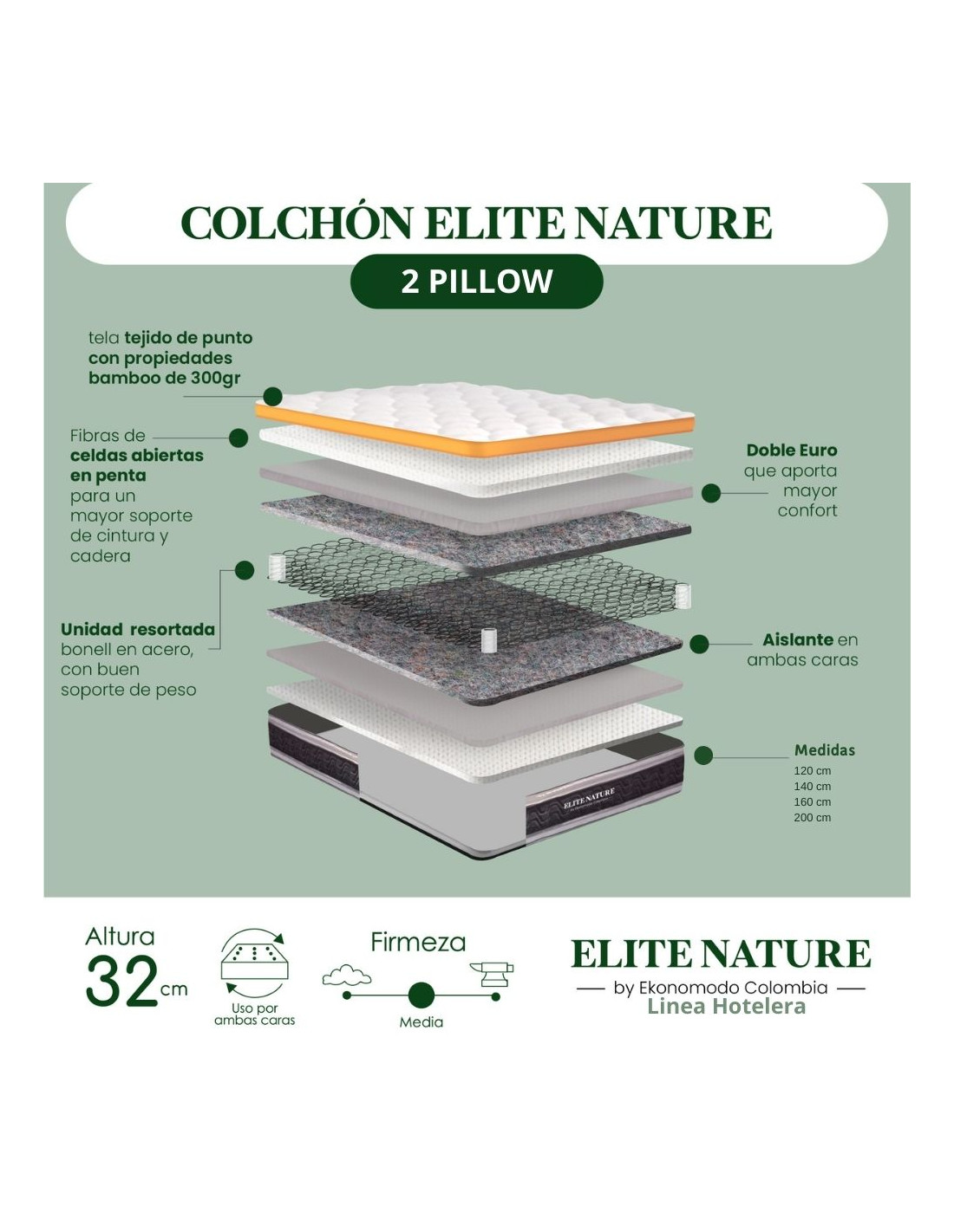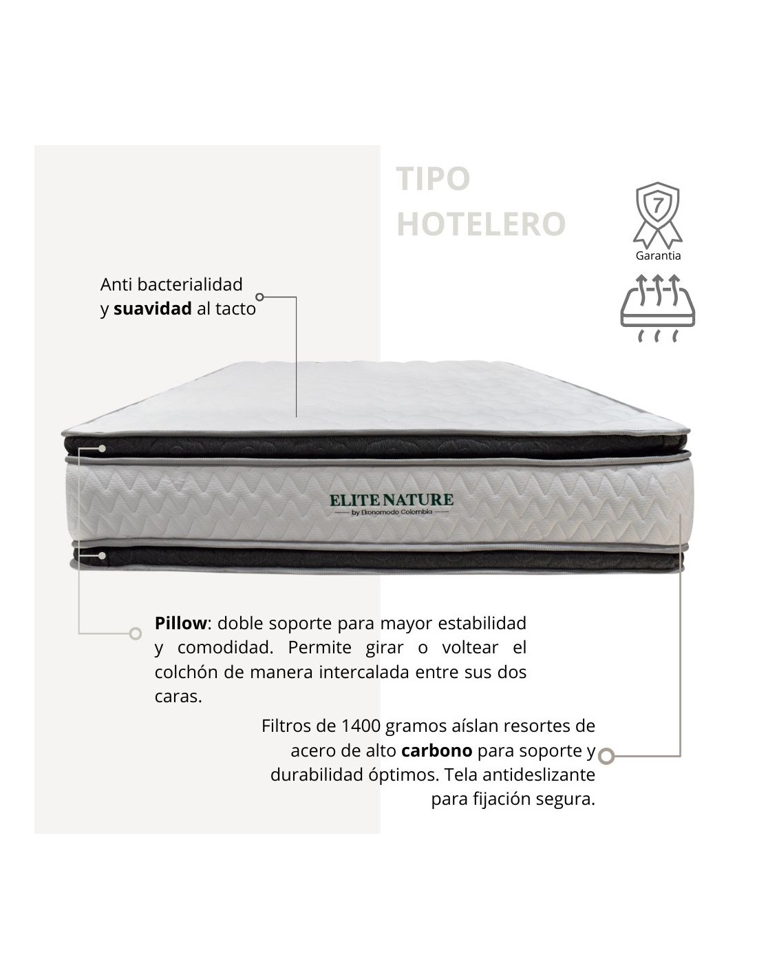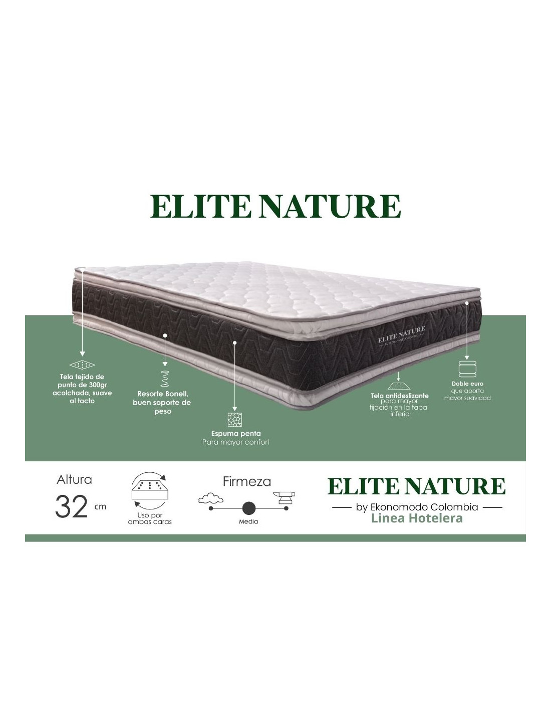 Nuestro colchón hotelero de Ekonomodo ofrece una experiencia de descanso superior con materiales de alta calidad y diseño ergonómico. Fabricado con resortes Bonnell de acero de alto carbono, garantiza firmeza, durabilidad y soporte ortopédico, adaptándose a las formas del cuerpo. La espuma Penta de densidad 26 añade confort y durabilidad, mientras que el pillow, una capa acolchada extra, proporciona una suavidad adicional para un descanso placentero. La tela de punto de 300 gramos con propiedades de bambú aporta frescura, suavidad y protección antibacterial, además de una base antideslizante para mantener el colchón en su lugar.